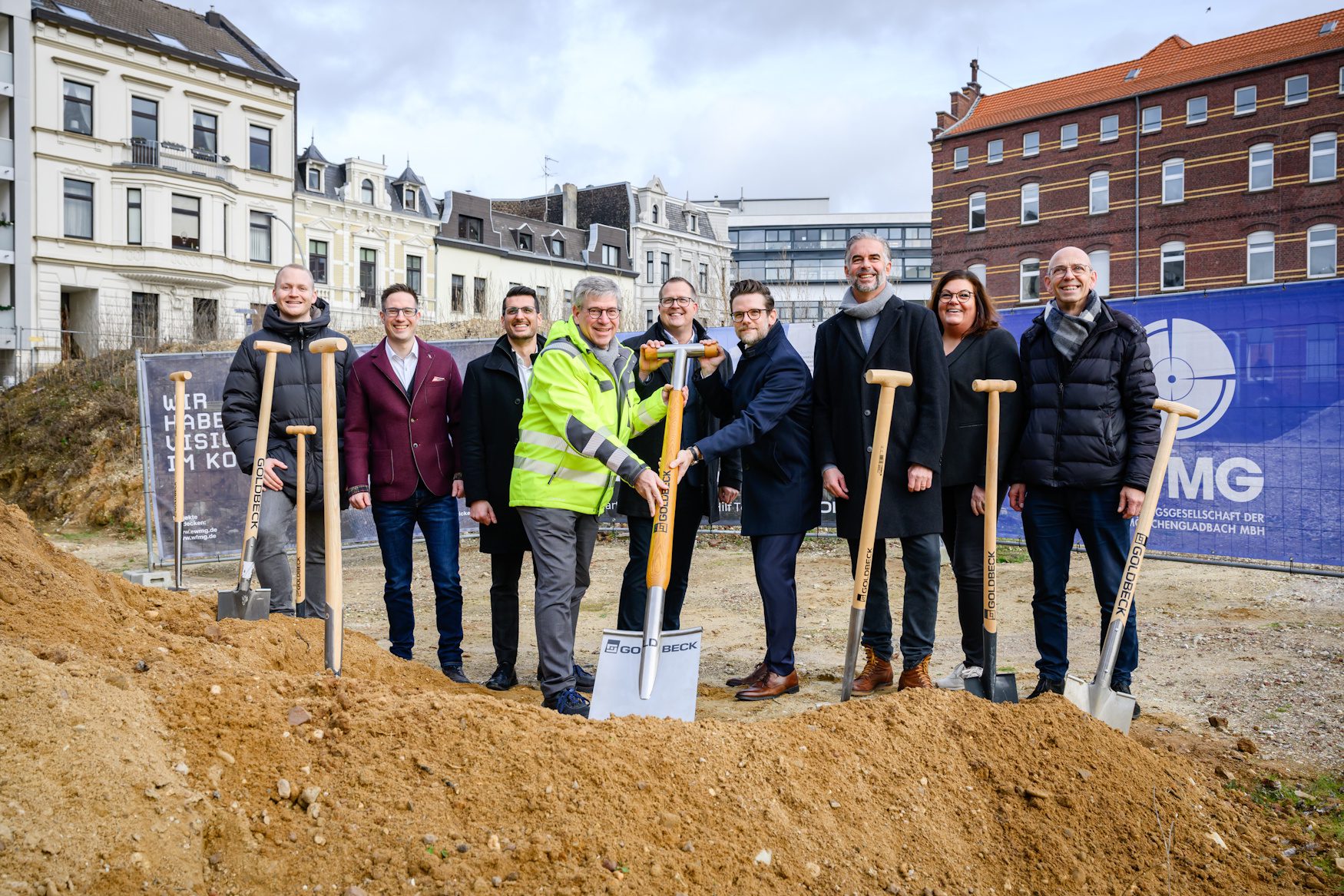 Es ist Bewegung auf den Maria Hilf Terrassen. Der Bau der Quartiersgarage für das neue, weitestgehend verkehrsberuhigte Wohnquartier ist gestartet. Mit dem symbolischen ersten Spatenstich brachten Vertreter der Stadt, der Bauherrin EWMG, des Betreibers ParkenMG und des ausführende Generalunternehmens Goldbeck West GmbH heute das Bauvorhaben offiziell auf den Weg.